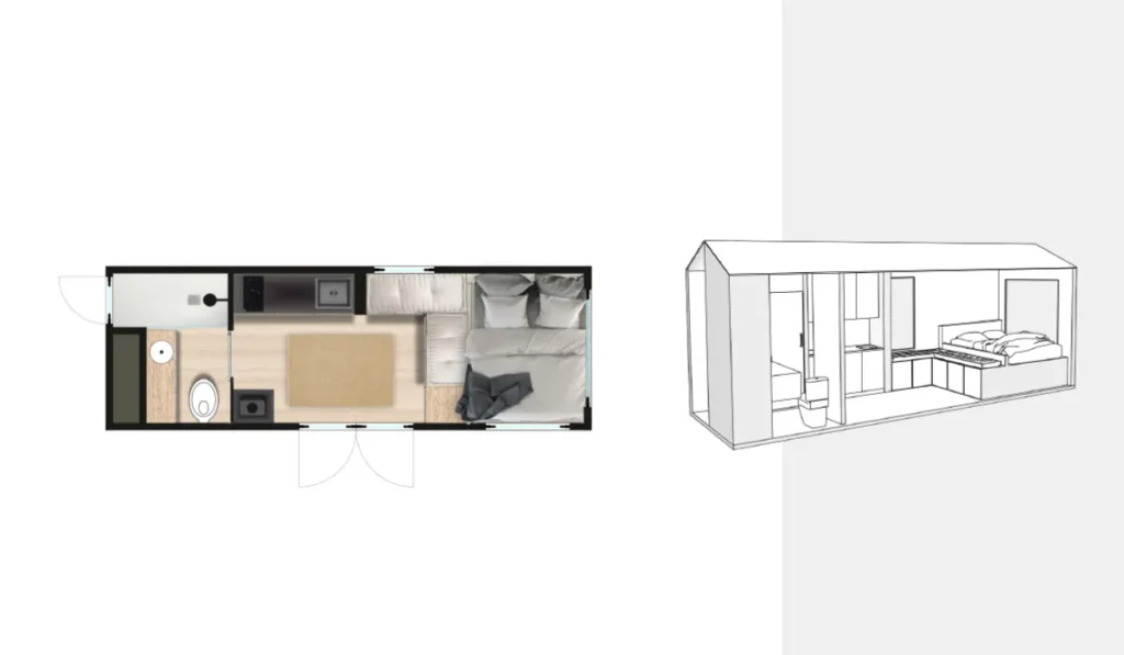 Uma solução inovadora e versátil ideal para alojamento local, com aprox. 18 m². Este modelo é projetado com um conceito de open space inteligente, onde a sala se transforma também em quarto, otimizando a utilização do espaço e proporcionando conforto tanto para relaxar quanto para dormir.